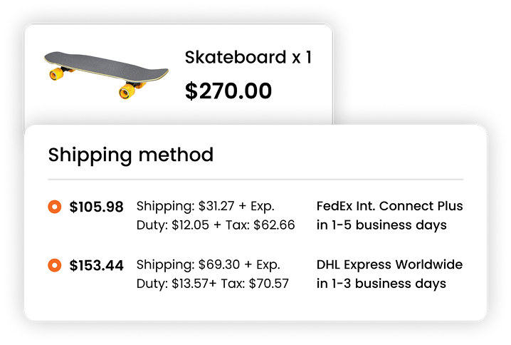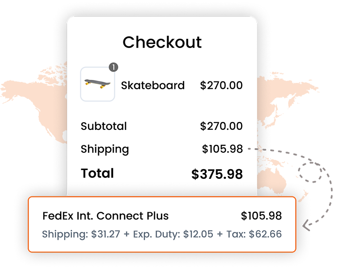 Displaying duty and tax estimates alongside shipping rates creates a precise landed cost at checkout. This provides customers with all the costs needed to make an informed purchase decision. In turn, this increases the likelihood they complete their purchase and enhances the chance they buy from you in the future.
