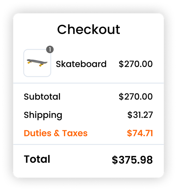 Displaying duty and tax estimates alongside shipping rates creates a precise landed cost at checkout. This provides customers with all the costs needed to make an informed purchase decision. In turn, this increases the likelihood they complete their purchase and enhances the chance they buy from you in the future.